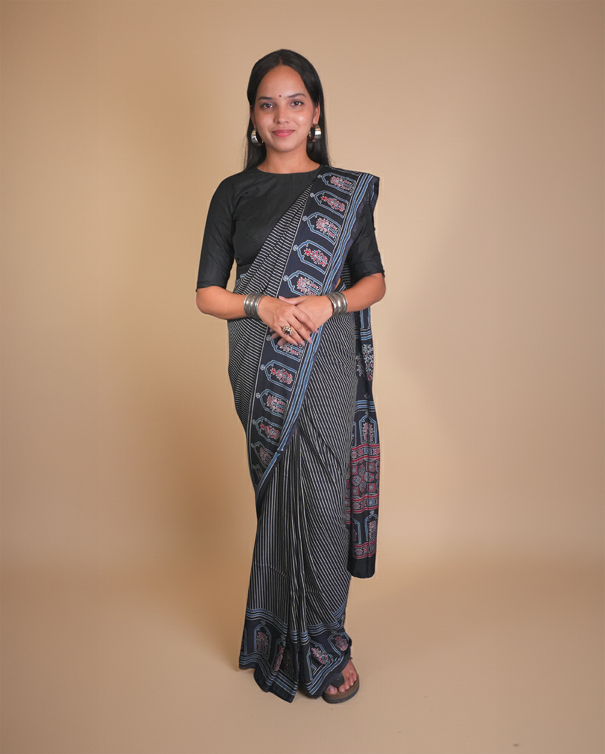 Elegant and sophisticated, this black cotton saree with fine white stripes and intricate Ajrakh-style border detailing makes a bold statement. Its artisanal design and breathable texture make it perfect for both formal and festive wear.