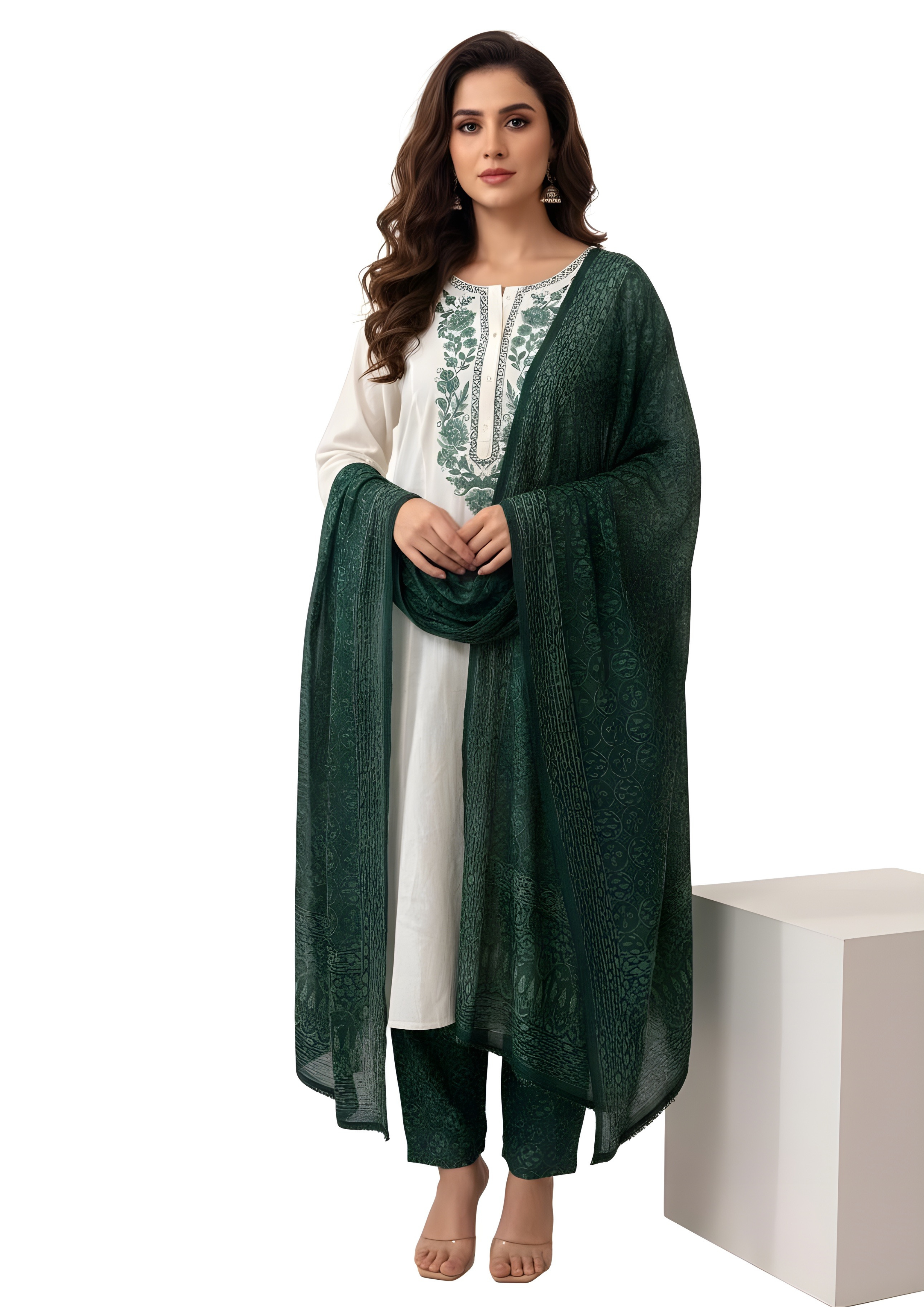 A classic white straight-cut Kurti set with delicate white Chikankari-style embroidery around the neckline. It is beautifully contrasted by a vibrant dark green dupatta and palazzo pants featuring an all-over geometric print, offering an elegant yet bold contrast.