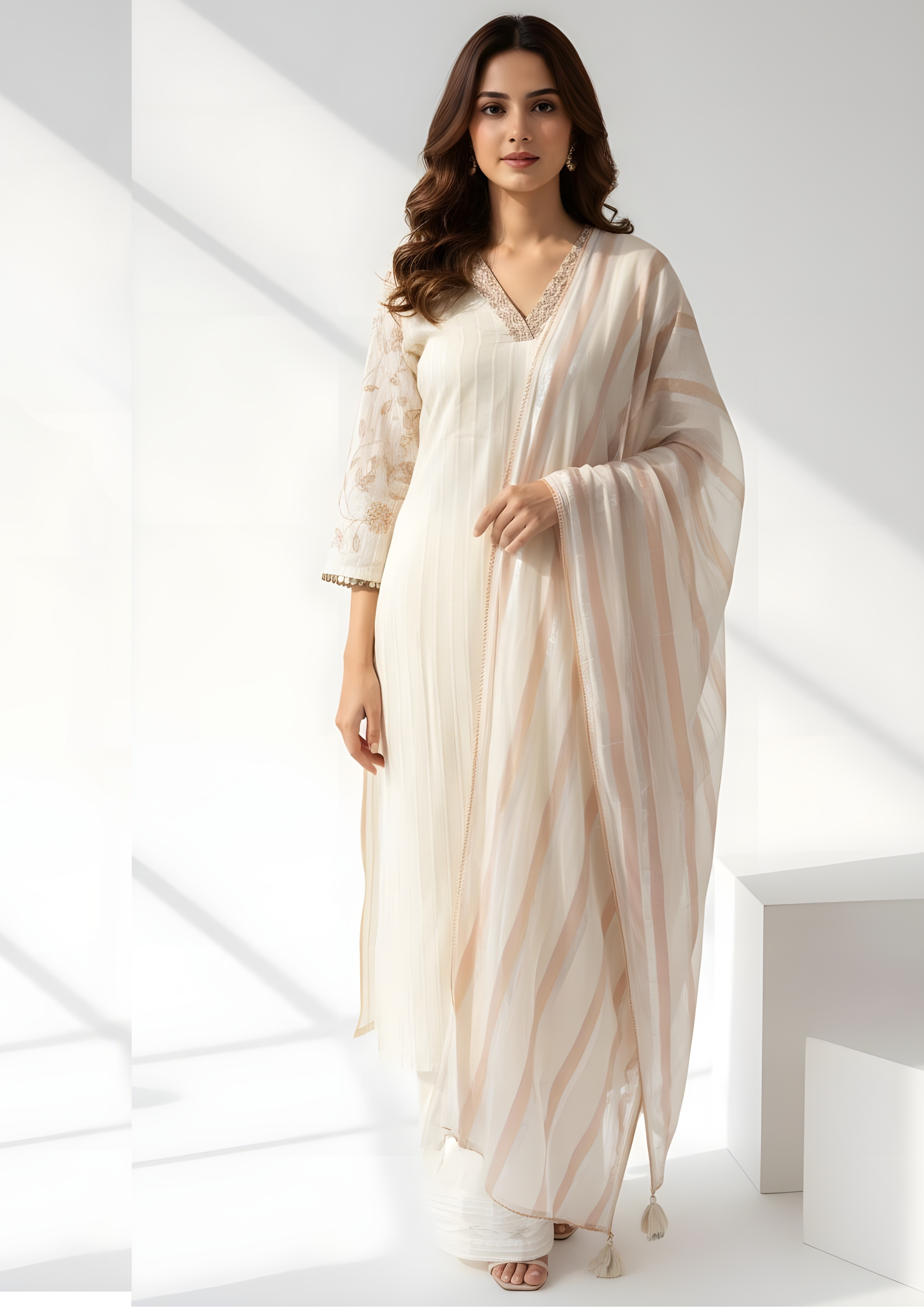 A gorgeous off-white Kurti set featuring an A-line Kurti with subtle self-striping and bell sleeves, accented by shimmering gold and peach striped detailing and intricate lace trim on the V-neck. It is paired with cropped wide-leg trousers and a coordinating...