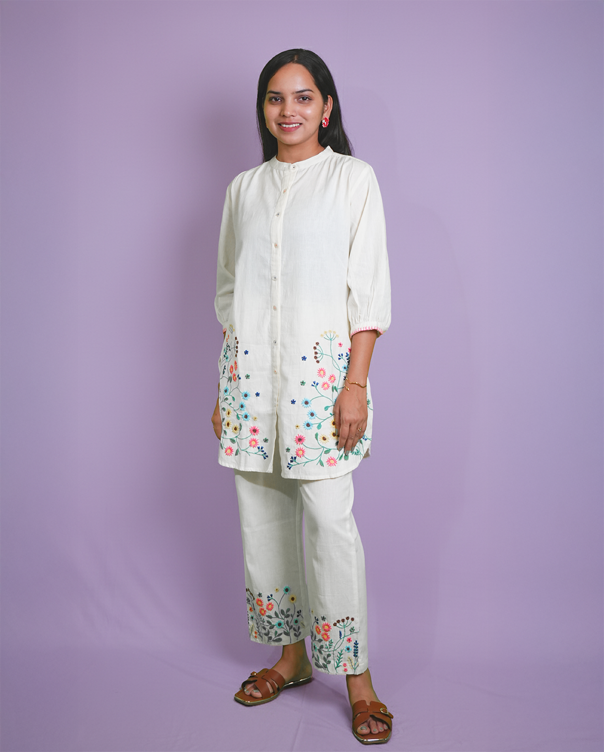 An elegant black Kurta and trouser set featuring intricate and colorful Phulkari-style embroidery across the yoke, sleeves, and hem. The vibrant threadwork and contrast piping offer a stunning detail against the rich black fabric.