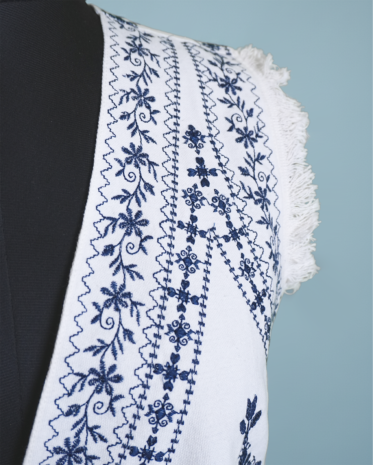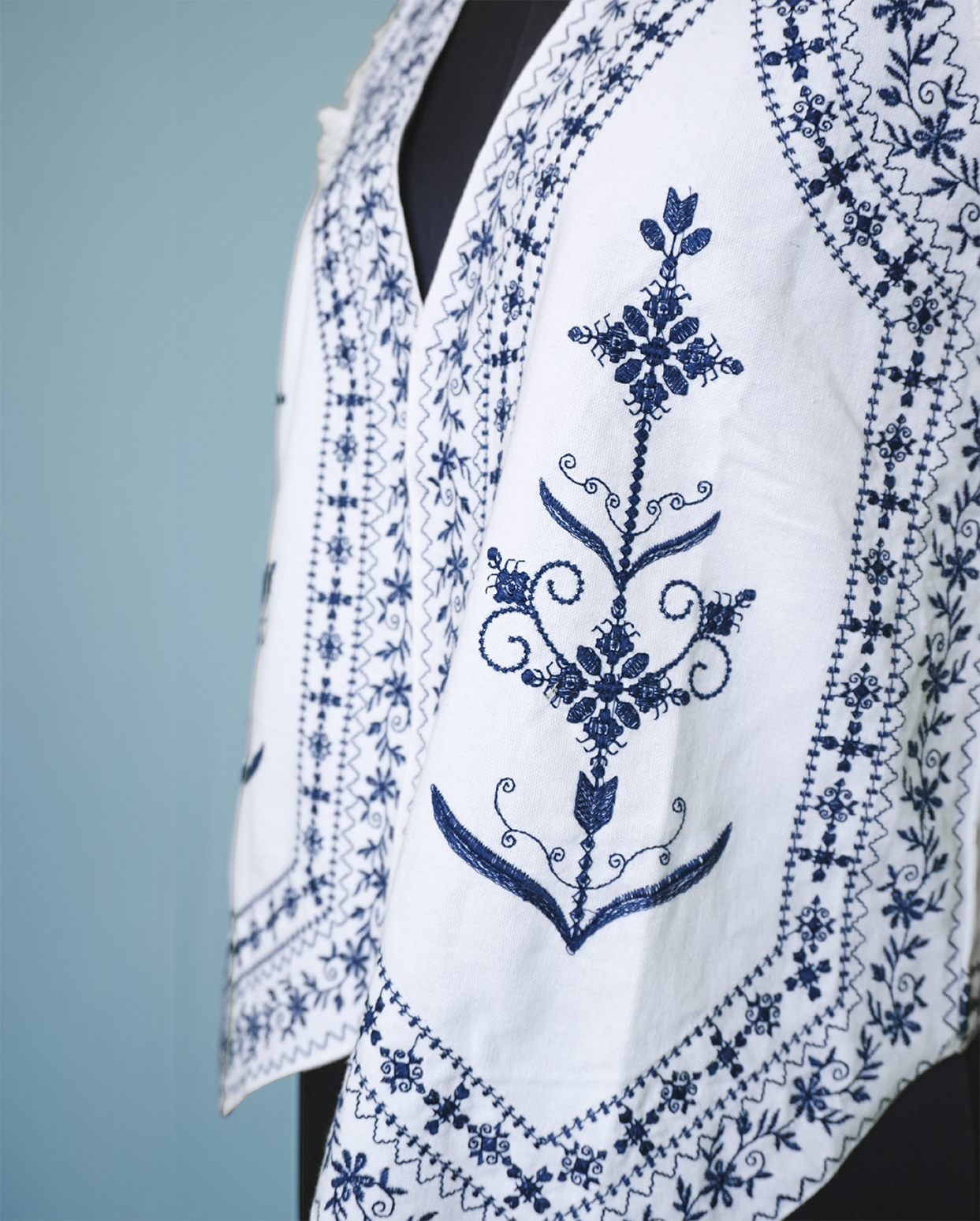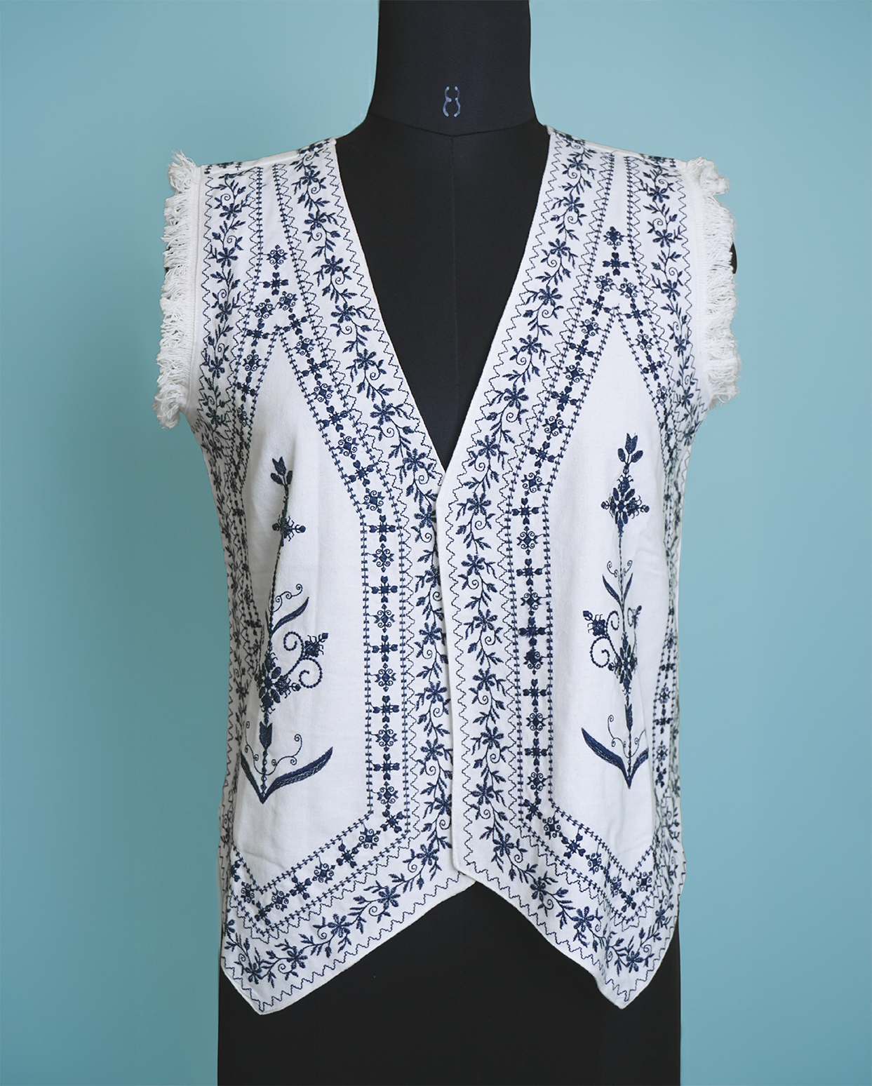A bohemian-inspired white denim waistcoat featuring a deep V-neck and a fitted silhouette. It is heavily adorned with striking blue thread embroidery in floral and geometric patterns, complete with frayed edges on the shoulders.